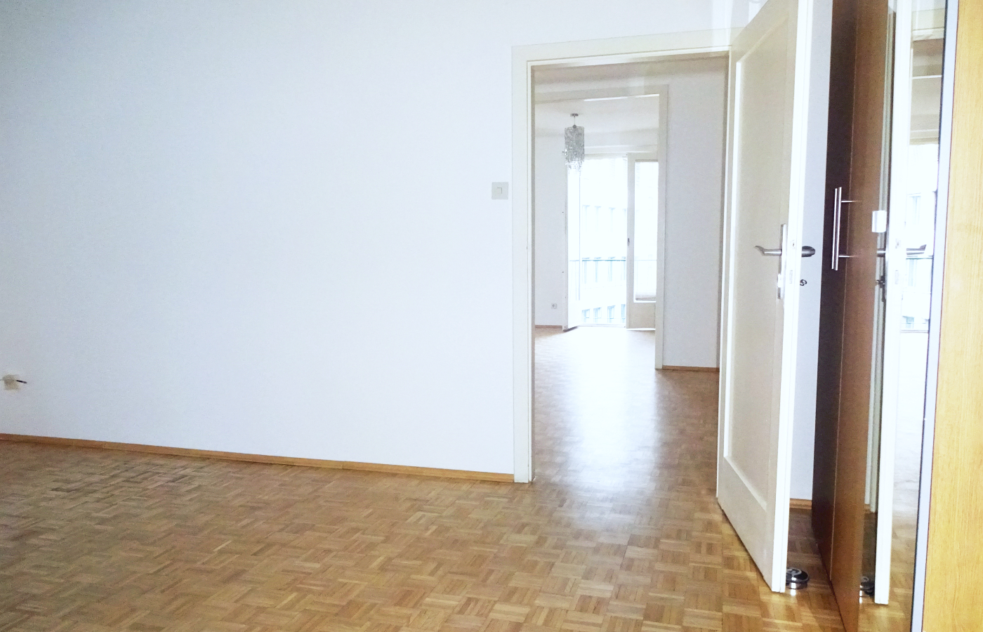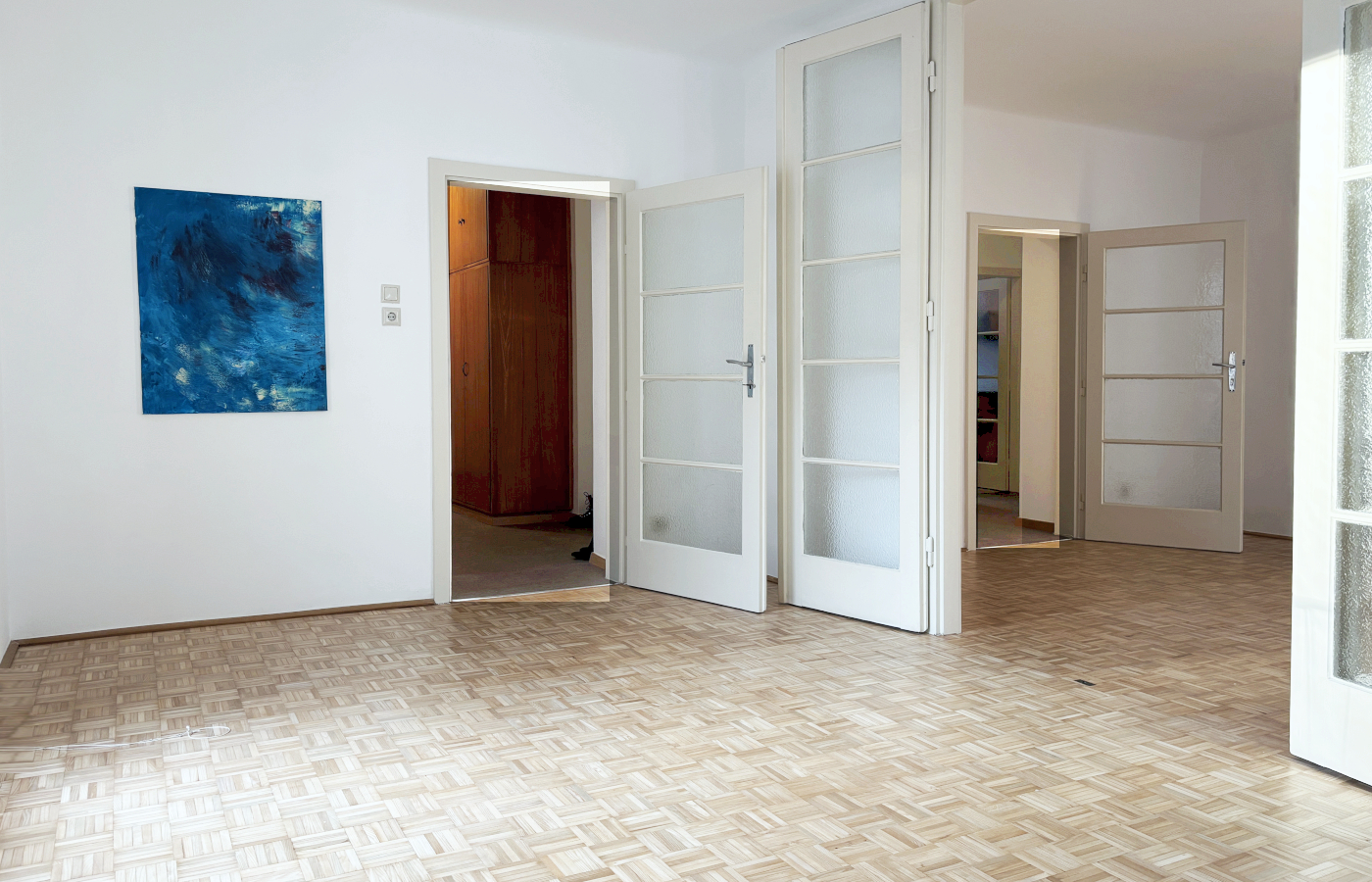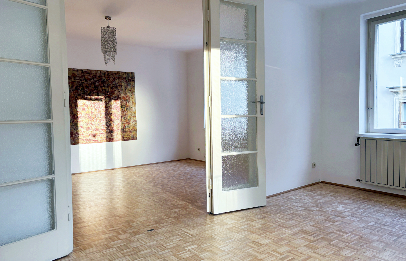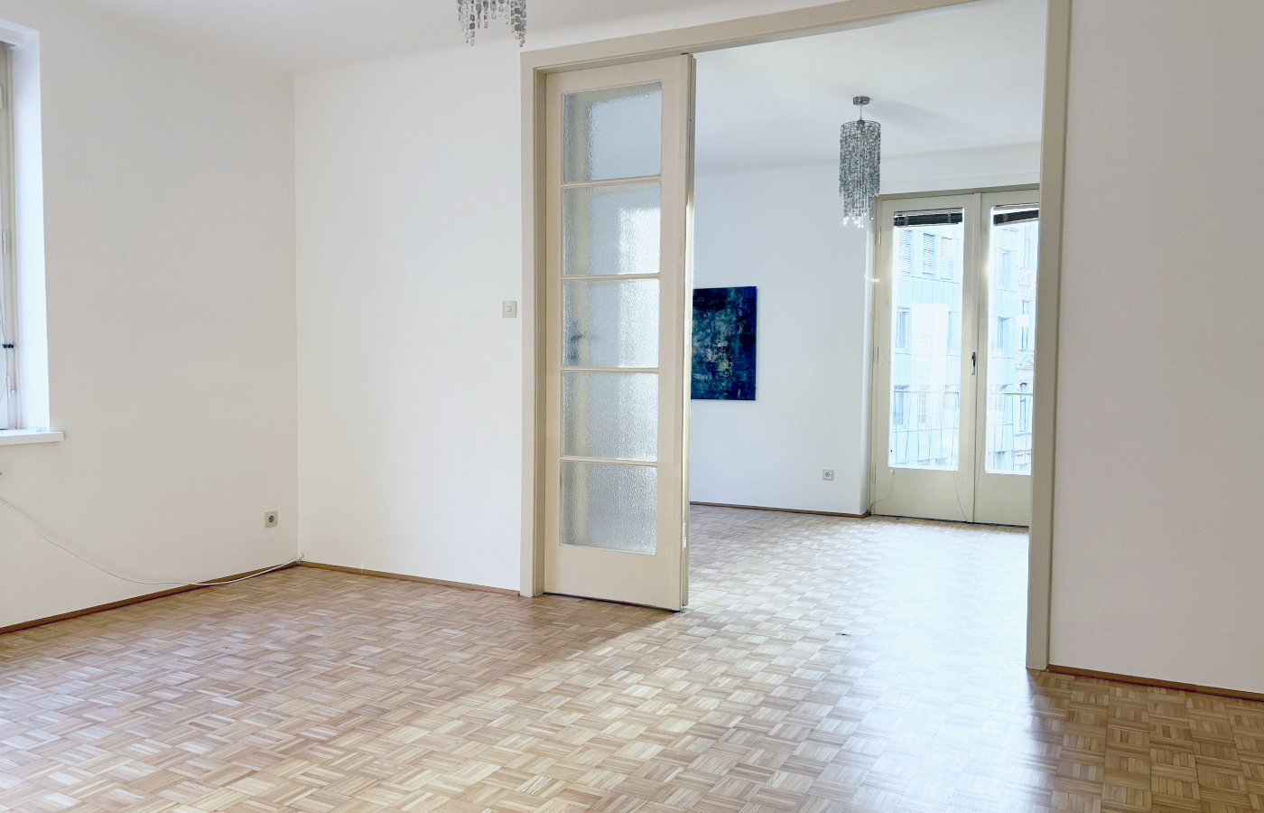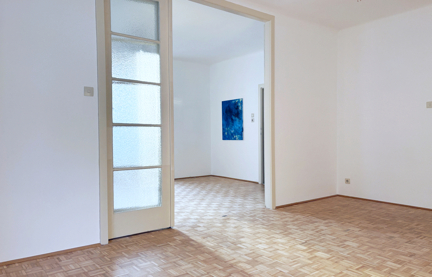 Besonders einladende Stimmung verleihen die drei aneinander gereihten Wohnräume. Die 3-teilige Glastür zwischen Zimmer 1 und Zimmer 2 unterstreicht den großzügigen Charakter und läßt besondere Flexibilität in der Raumnutzung zu. Sind Kinder an Bord?